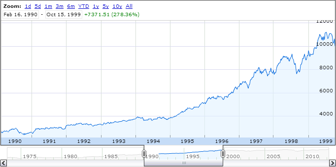 I did my homework over the weekend. We were due to make our “trades” the following Monday. This was back in 1999 when markets were booming. The logical choice was to pick “hot” stocks like Apple, Microsoft, IBM, etc, and to buy and hold them. The markets were booming like crazy during those times. This was the age of the Internet Boom, before the September 11th attacks, and during the Clinton era. Placing myself at the time, here is what the 10-year chart looked like for the Dow Jones Industrial Average, the “equivalent” of India’s Sensex.