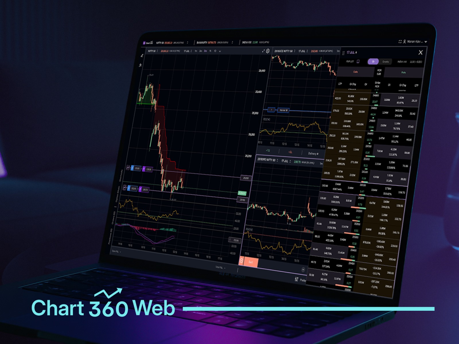 Analyse CE/PE & Index charts together, execute from the chart, draw trendlines, and track P&L in real-time. Everything you love on mobile is now shaped for the desktop.