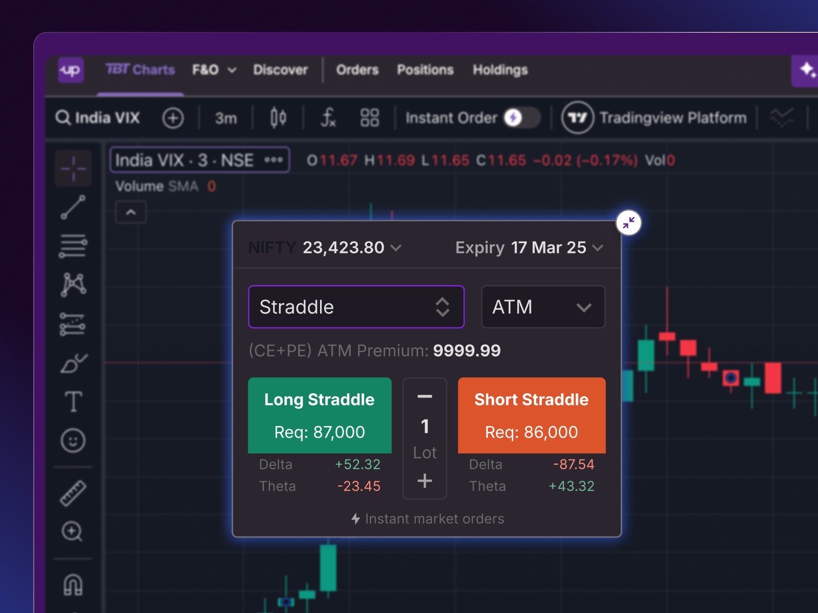 Now, directly trade Long or Short Straddles and Strangles from the India VIX chart on Pro Web & TradingView. Spot volatile moves and act instantly based on the strategy that suits you best.